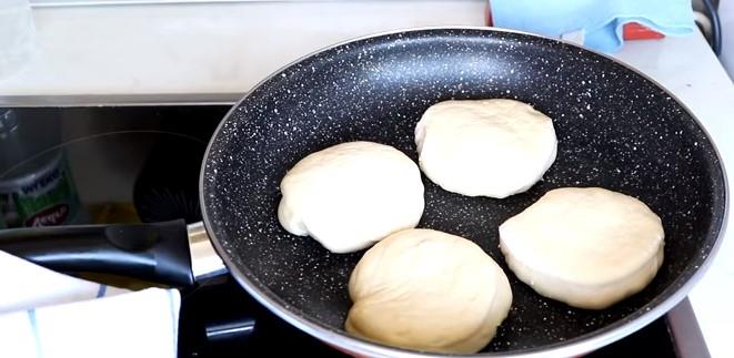 Umesiti mekše testo da bude glatko pa ga pustiti da malo poraste. Istresti na radnu površinu razviti za 1 cm debljine i vaditi krofne malo veće. Opet ih ostaviti da porastu. Veći teflonski tiganj ugrejati pa kad se ugreje pore]ati hlebčiće i poklopiti.