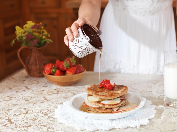 Napravite male, debele palačinke koje ćete pržiti na tiganju, a koji ste prethodno namazali puterom. Kada završite, složite ih jednu na drugu. Na kraju ih prelijte javorovim sirupom, ali umesto toga možete koristiti med ili preliv po želji.