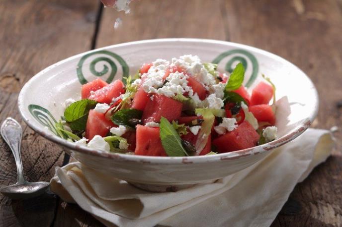 Prebacite komadiće lubenice u činiju, posolite, pobiberite, dodajte komadiće fete i prelijte balzamikom.