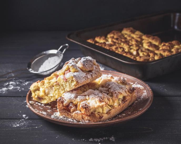 Penasto umutiti mast, jaja i šećer pa dodati mleko, rendanu koru limuna i brašno pomešano sa praškom za pecivo da se zamesi fino testo da može lepo da se oklagija i ne lepi za sto. Testo podelite na dva dela. Jednu koru staviti u pleh, preko fil od narendanih jabuka, (jabuke ne treba cediti od soka) prezle i cimeta, pa posuti jabuke šećerom, i staviti drugu koru.