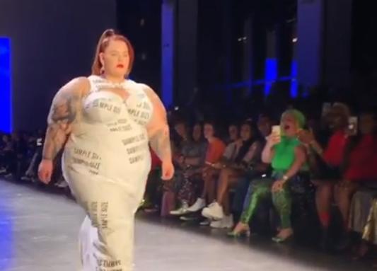 Američka plus sajz manekenka Tes Holidej (34) prošetala je pistom njujorške Nedelje mode, pritom se držeći za grudi. U uskoj beloj haljini pokazala je svojih 127 kilograma te je provocirala publiku, pri čemu su mnogi oduševljeni njenim samopouzdanjem.