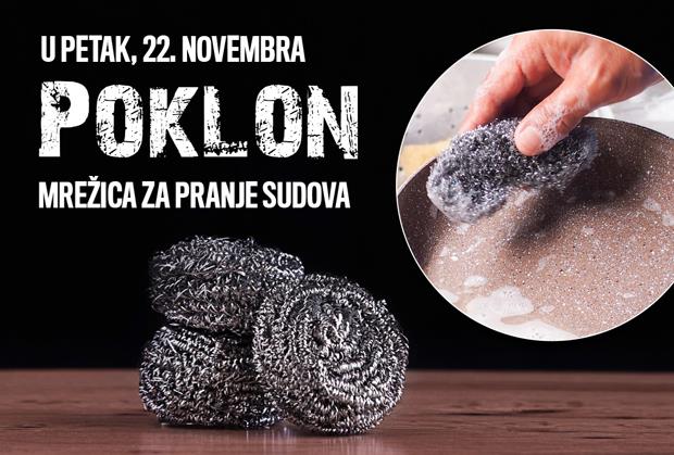 Svaki čitalac dnevnih novina Kurir u petak, 22. novembra, dobiće na poklon MREŽICU ZA PRANJE SUDOVA. Napravljena je od nerđajućeg čelika, što je čini dugotrajnom. Sa mrežicom koju ćete dobiti u Kuriru ćete moći da uklonite i najtvrdokornije fleke sa vaših šerpi i tanjira. Ovo bi svaka kuhinja trebalo da ima!