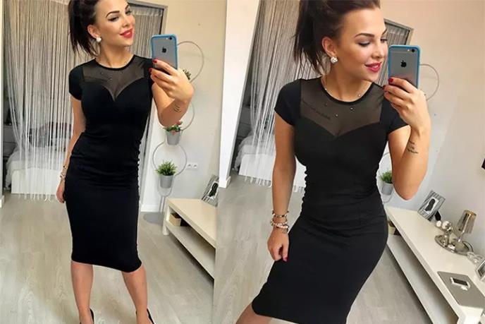 Ova crna haljina je do kolena, što je savršena dužina za svaki tip građe. Ona će istaći vaše kukove i samim tim vas učiniti još ženstvenijom i elegantnijom. Ima kratke rukave, a deo koji ide preko grudi je providna crna mrežica. Nije vulgarna, ali je dovoljno otvorena da vas čini zavodljivom i seksi i istakne grudi na primeren način.