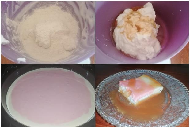 Sir, jaja, ekstrat vanile, 150 g kiselog mleka se umuti i stavi u tepsiju. Zatim ide 100 g mladog sira, 50 g kiselog mleka, 30 g vej protein, malo ekstrakta od vanile i dodas malo vode, da bude gušće od prve smese da se ne bi sjedinile u plahu. Pecite 45 minuta na 150 stepeni.