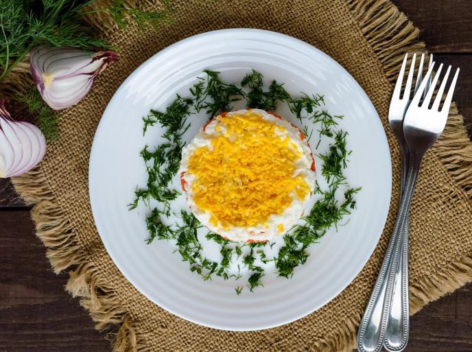 5. Narendajte sir, pospite po krastavčićima, pa premažite majonezom. Oljuštite jaja i odvojite belanca pa ih narendajte preko salate. I ovaj sloj premažite majonezom, pa narendajte žumanca i ukrasite mirođijom. Ostavite da se dobro rashladi u frižideru.