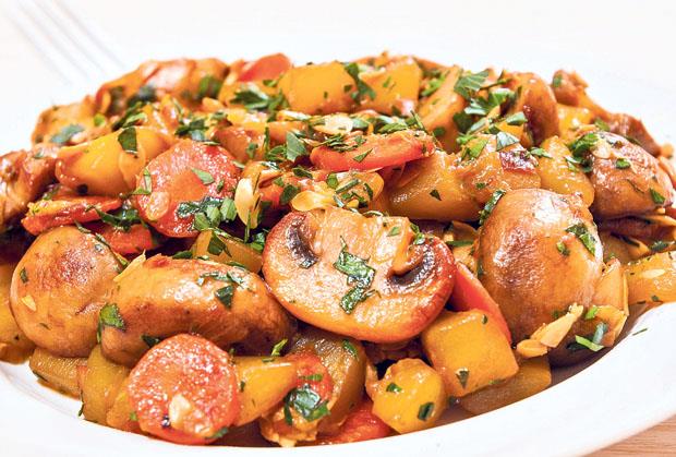 1. Iseckati krompir na kriške, šargarepu na kolutove, papriku na kolutove, pečurku bukovaču na srednje komade.
