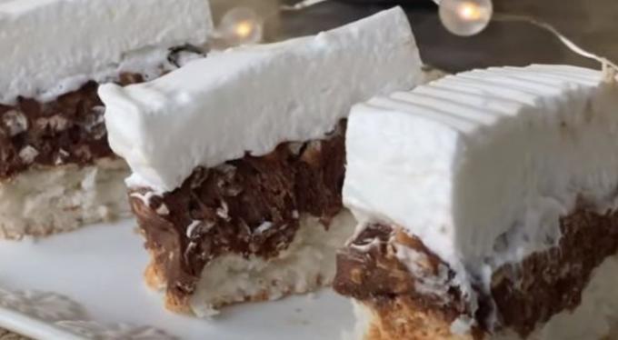 Belanca i šećer izmiksirati. Zatim dodati brašno, sirće i kokosovo brašno. Sjediniti i peći na 200 stepeni 15-20min. Žumanca za fil miksirati na pari, dodati vanilicu i šećer. Staviti margarin i čokoladu sa rižom i sve sjediniti. Sipati preko kore i ostaviti da se hladi par sati. Po želji dekorisati šlagom.