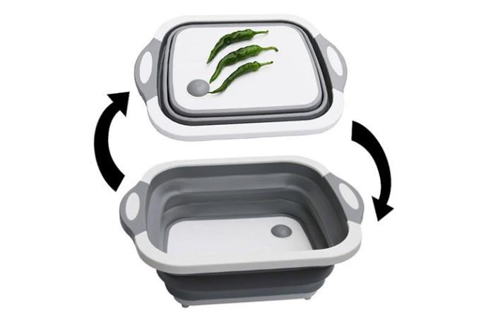 Jedna od najkorisnijih „sprava“ koje naprosto morate imati u kuhinji – cediljka 3 u 1! Ovo je fenomenalna posuda koja, dok se ne povuče ka gore, liči na običnu dasku. Ali nije samo daska! Ona može da bude i daska za sečenje, ali pored toga može da se rastegne i da se na taj način napravi posuda u koju možete odložiti namirnice i oprati ih. I ne samo to – u njoj ih možete i procediti pritiskom na dugmence na dnu kroz koje će izaći voda kada poželite da ispraznite posudu.