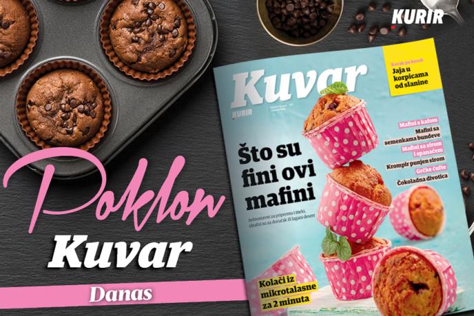 Danas ćete uz dnevne novine Kurir dobiti na poklon KUVAR:ŠTO SU FINI OVI MAFINI. Jednostavni za pripremu i meki, idealni su za doručak ili lagani desert. Otkrivamo, korak po korak: jaja u korpicama od slanine! Čekaju vas i recepti za ukusne mafine kao što su: mafini s kafom, mafini sa semenkama bundeve, mafini sa sirom i spanaćem, krompir punjen sirom, grčke ćufte, čokoladna divotica, kao i za kolače iz mikrotalasne za dva minuta.