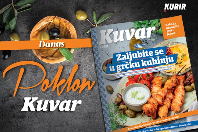 Danas ćete uz dnevne novine Kurir dobiti na poklon KUVAR:ZALJUBITE SE U GRČKU KUHINJU. Ukus i miris Mediterana, jela začinjena belim lukom, maslinovim uljem i feta sirom, zbog svega toga su specijaliteti iz ove zemlje među najpopularnijim na svetu. Pokazaćemo vam kako da napravite grčki jogurt! Čekaju vas i recepti za ukusna jela kao što su: giros, caciki, suvlaki, tiropita, solunske tikvice, tradicionalna mlečna pita, sočni kolač s pomorandžama, lukumades i mnoga druga.