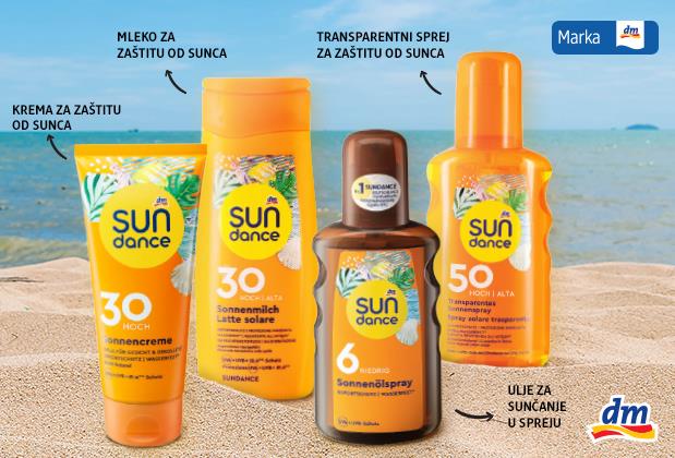 Zato smo za vas pripremili nekoliko trikova za bezbedan boravak na suncu i najefikasniju zaštitu kože, a širok izbor proizvoda s faktorom zaštite od sunčevih zraka možete pronaći u najbližoj dm drogeriji. Odličan saveznik u zaštiti od sunca su preparati privatne robne marke SUNDANCE. Ukoliko se još niste upoznali s ovom markom, krajnje je vreme da otkrijete zašto su joj u Nemačkoj hiljade građana poklonile poverenje, čime je postala brend broj 1 u kategoriji proizvoda za sunčanje. Osim nemačkog kvaliteta i pristupačnih cena, ove proizvode krasi i tradicija duga 25 godina. Pažljivo biran asortiman zadovoljava različite potrebe – od balzama za usne, krema, preko fluida, mleka, sprejeva za zaštitu od sunca, do proizvoda za najmlađe članove porodice, a tu su i preparati za održavanje hidratantnosti kože nakon sunčanja.