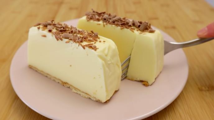 Pomešajte želatin sa vodom, a žumanca, šećer i vanilin šećer umutite, pa stavite da se kuva. Zatim sipajte mleko i ostavite da proključa. Sklonite sa šporeta i dodajte nabubreo želatin i sve to pomešajte, a zatim ubacite grčki jogurt. Smesu sipajte u posudu veličine 12×20 santimetara koju ste prethodno obložili pek papirom, a zatim preko stavite keks. Posudu prekrijte providnom folijom i stavite je u frižider da odstoji tri sata. Nakon toga, izvadite posudu iz frižidera, okrenite kolač na neku tacnu, izvadite ga iz posude i pospite rendanom čokoladom.