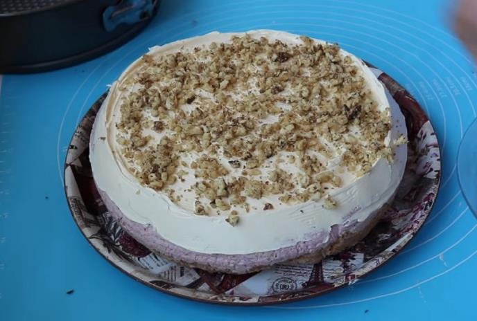 Umutiti kiselu pavlaku sa šećerom u prahu i vanilom. Slatku pavlaku takodje umutiti, pa sve spojiti. Podeliti na 2 dela. U jedan deo dodati mlevenu plazmu i 3-4 kašike mleka, a u durgu mlevene orahe i rastopljenu čokoladu i ekstrate maline ili jagode. Sve dobro izjednačiti. Okrugli pleh prečnika 24 cm obložiti prozirnom folijom. Na dnu rasporediti čokoladni deo, a preko deo sa mlevenim orasima. Preko staviti nekoliko piškota umočenih u mleko. Ušuškati pa staviti u zamrzivač na sat-dva. Izvrnuti na poslužavnik. Odozgo umutiti 100 gr šlaga i posuti seckanim orasima. Staviti ponovo u zamrzivač da se dobro ohladi.