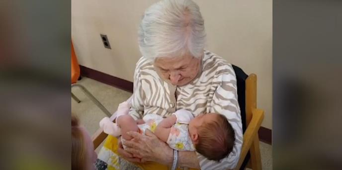 Gospođa sa snimka ima 108 godina. Ona se veoma obradovala kada je neko poseban ušao u prostoriju prvi put - njena praunuka. Beba od nekoliko dana.