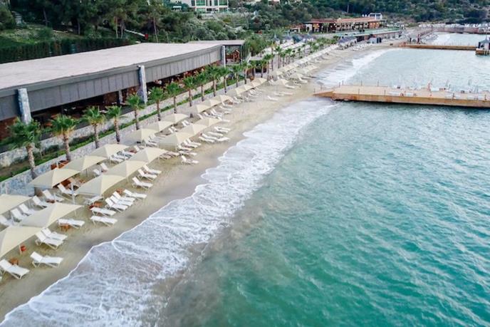 Iako na samo 8 kilometara od centra Bodruma, dobro je sačuvan od gradske žurbe, sakriven u zalivu nad kojim se nadvijaju ljupka brdašca. Njegovo sjajno prirodno okruženje – zelenilo trave, drva palme i beli pesak – iskorišćeni su kao inspiracija za dizajn ovog velelepnog kompleksa ukrašenog mnoštvom bazena.