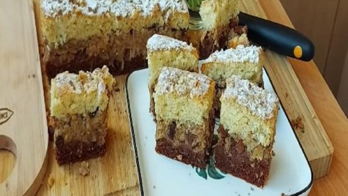 Preko njega dodati svetli deo testa, izjednačiti i peći oko 40-45 minuta na 190 stepeni.