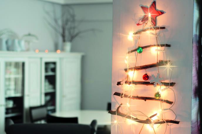 Pravljenje ovakve improvizovane jelke može postati zanimljiva aktivnost u kojoj će učestvovati cela porodica. Tokom šetnje ispod drveća prikupite nekoliko srušenih komada drveta različitih dužina koje ćete pomoću kanapa na krajevima kao na slici pretvoriti u drvce za ukrašavanje. Ukrasi mogu biti raznoliki, lampice su obavezne, a na vrh nemojte da zaboravite da stavite takođe drvenu zvezdu.
