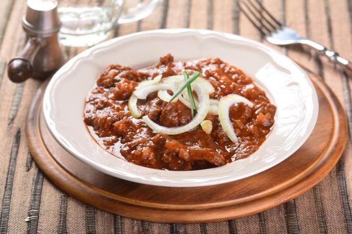 650 g junetine (od vrata ili plećke) - 100 g suve slanine - 4 glavica crnog luka - 3 čena belog luka - 2 dl soka od paradajza - 2 dl belog vina - 1 velika kašika crvene začinske paprike - 1/2 male kašike ljute začinske paprike - 1 dl goveđe supe (vode) - so, biber