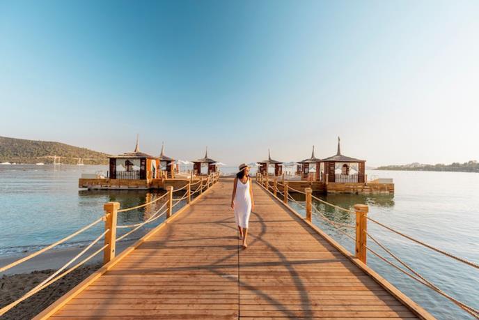 Iako na samo 8 kilometara od centra Bodruma , dobro je sačuvan od gradske žurbe, sakriven u zalivu nad kojim se nadvijaju ljupka brdašca. Njegovo sjajno prirodno okruženje – zelenilo trave, drva palme i beli pesak – iskorišćeni su kao inspiracija za dizajn ovog velelepnog kompleksa ukrašenog mnoštvom bazena.