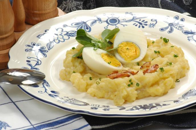1. Skuvajte krompir, procedite, ispasirajte i dok je još vruć, dodajte margarin i mleko.