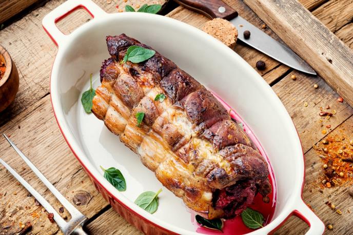 4. Izvaditi sud iz rerne, podići foliju, meso okrenuti, ponovo zatvoriti i vratiti u rernu. Deset minuta pre završetka pečenja, skinuti foliju i meso zapeći da bi dobilo koricu.