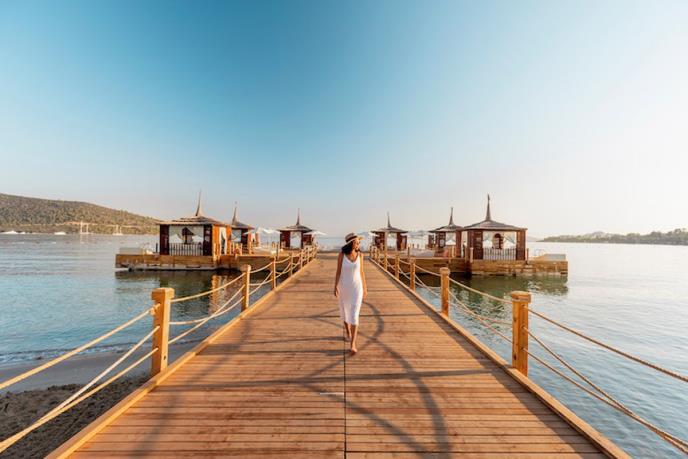 Iako na samo 8 kilometara od centra Bodruma , dobro je sačuvan od gradske žurbe, sakriven u zalivu nad kojim se nadvijaju ljupka brdašca. Njegovo sjajno prirodno okruženje – zelenilo trave, drva palme i beli pesak – iskorišćeni su kao inspiracija za dizajn ovog velelepnog kompleksa ukrašenog mnoštvom bazena.