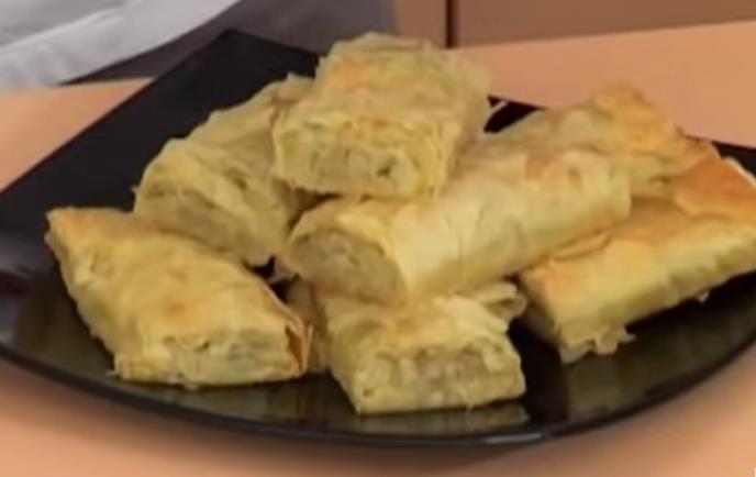 3.Testo stavite na pobrašnjenu radnu površinu i razvucite ga, da bude tanko. Još ga malo istanjite oklagijom, isecite pažljivo na šire trake na koje ćete staviti fil i potom ih zaviti. Dodatno ih oblikujte rukama.