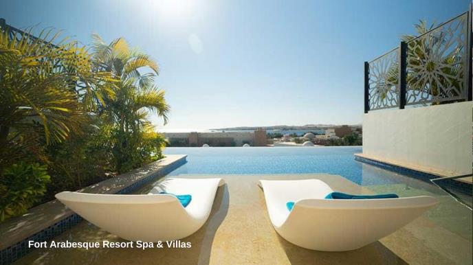 Fort Arabesque The Villas je deo hotela kaskadno orijentisan, nekoliko redova sa vilama koje su povezane bazenom ali tako da svaka ima dovoljno privatnosti. Vila swim up one bedroom je veličine oko 90m2 i sastoji se od dnevnog boravka i spavaće sobe, ima terasu i direktan izlaz na bazen. Vila swim up two bedroom je dupleks veličine oko 90m2 i sastoji se od dve spavaće sobe, dnevnog boravka, dva kupatila.