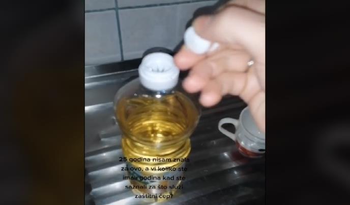 Žena je pokazala koja je zapravo svrha zaštitnog čepa na ulju, koje uglavnom svi bacimo u kantu za smeće. Naime, ona čep sa delom za povlačenje okreće "naopačke", i ponovo ga postavlja na otvor flaše. Zatim je pokazala kako tako postavljen čep smanjuje i kontroliše mlaz ulja.
