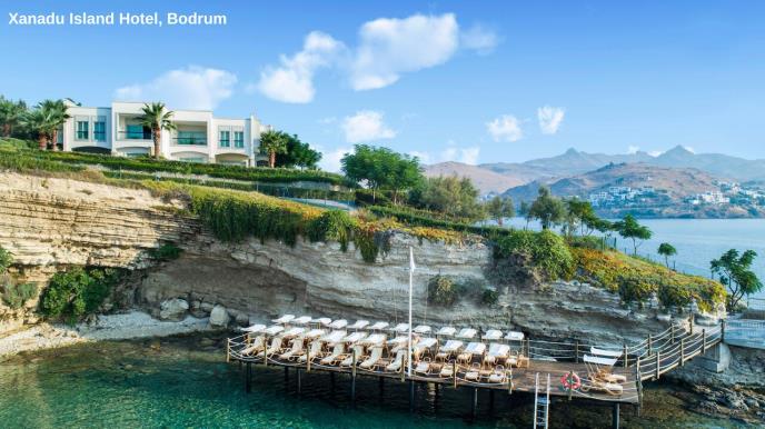 Za ljubitelje dobrih hotela u Egejskoj regiji Turske, prava poslastica – Xanadu Island Hotel 5* - hotel koji se nalazi na privatnom poluostrvu, u mesto Akyarlar, oblast Turgruteis , 25 km od centra Bodruma, 60 km od Milas aerodroma. Izgrađen je 2010. godine. Hotel je okružen prelepo uređenim vrtovima i baštama, prepun je zelenila i cveća. U ponudi ovog eksluzivnog hotela su različiti tipovi soba i vila koji su smešteni u okviru četvorospratne glavne zgrade i manjim objektima u okviru kompleksa u kojima su smešteni neki tipovi apartmana i vila. Ovaj hotel poseduje i dva otvorena bazena, jedan zatvoreni bazen sa jacuzzi-jem, pešačku stazu oko poluostrva, glavni restoran, 2 à la carte restorana, nekoliko barova, Spa centar, fitnes centar. Za decu tu su otvoreni i zatvoreni bazen, Foxy Kinds club (4-12 godina), dečije igralište, animacije, dečiji bife za doručak, ručak i večeru, stolice za bebe u glavnom restoranu, krevetac za bebe.
