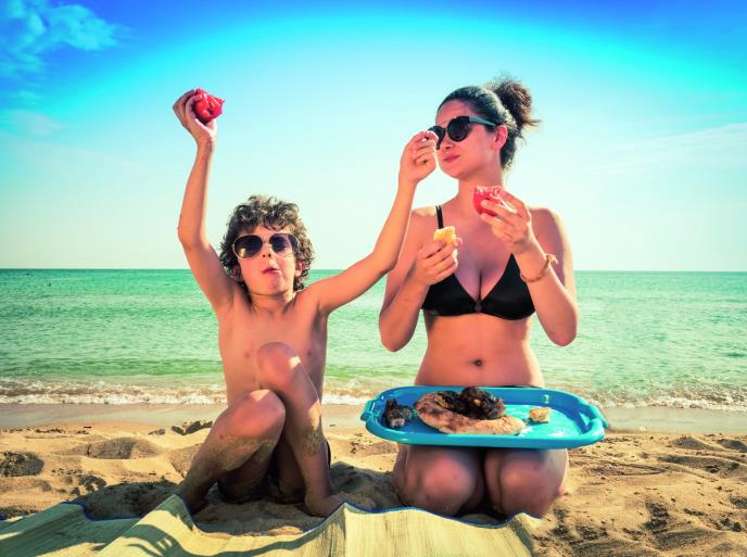 To znači da jedu na plaži, a šta bi drugo jeli nego suhomesnate proizvode, paštete, barena jaja i uz to, naravno - paradajz! Ima i voća, lubenica, slatkiša, mešaju se s peskom i šljunkom, deca vrište i trče po sendvič koji ih čeka na peškiru pored losiona za sunčanje, majke ih dozivaju da izađu iz vode da jedu, a onda onako musavi ponovo trče u more.