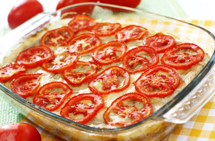 6. Dobijenu smesu prelijte preko tikvica, poslažite isečen paradajz na kolutove, stavite u rernu i pecite oko 15 minuta, pa pospite parmezanom i dopecite još pet minuta da jelo dobije boju. Ukrasite jelo peršunom ili vlašcem.