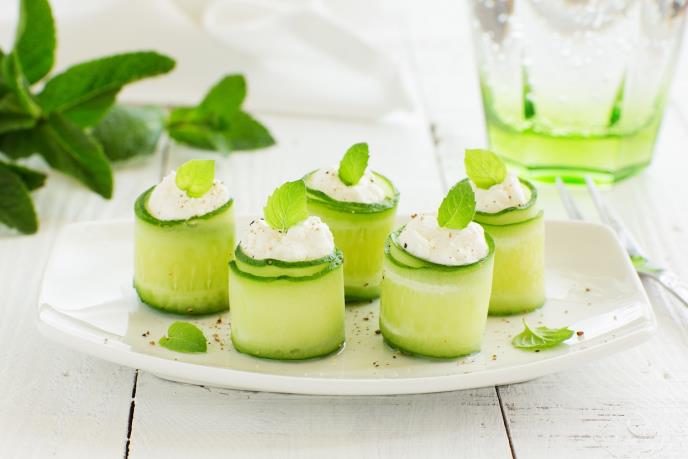 - Krastavac narežite na zalogaje, u svaki zabodite čačkalicu s listićem nane.