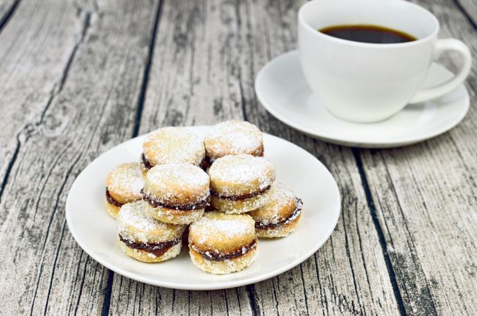 3. Pecite ih na 180 stepeni dok ne dobiju prepoznatljivu boju. Dva kolačića spojite domaćim pekmezom od kajsija. Kolače poređajte na poslužavnik i pospite vanilin šećer ukombinaciji sa prah šećerom.