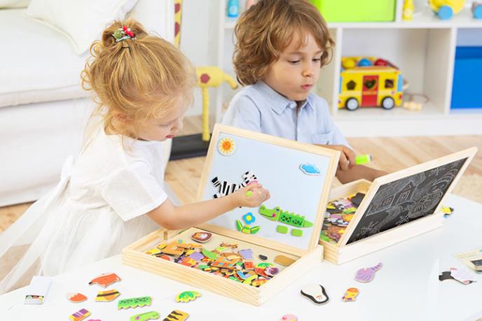 U pitanju je drvena kutija u kojoj se dobijaju životinjice, ali u delovima. Deca treba da ih sastave i to kačenjem na tablu koja je namagnetisana. Na taj način oni: