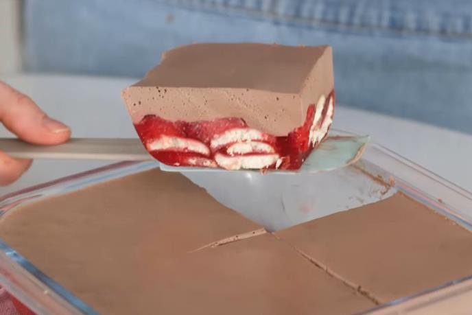 - Keks poređajte u posudu, a u šerpu sipajte šećer, pa dodajte jagode. Mešajte dok se ne istopi šećer, pa sipajte preko keksa.