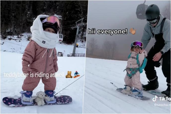 DEVOJČICA OD 18 MESECI OBOŽAVA SVOJ SNOUBORD! Uživa u zimskim sportovima i sa sobom stalno nosi MEDU: Apsolutno je preslatka!