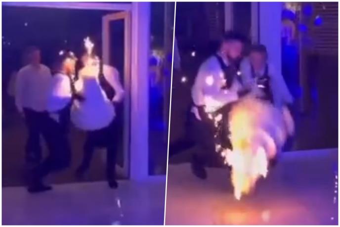 Početak ovog videa deluje sasvim normalno, dva konobara iznose veliku svadbenu tortu sa prskalicama. Samo momenat kasnije, torta ispada, a sa njom i oba konobara padaju na kolena.