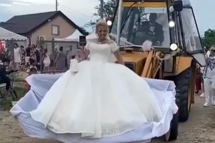 Naime, da se slučajno pažnja ne bi skrenula sa mlade, žena u belom odlučila je da sedne, ni manje ni više, nego na bager koji će da je provoza kako bi je svi gosti dobro osmotrili.