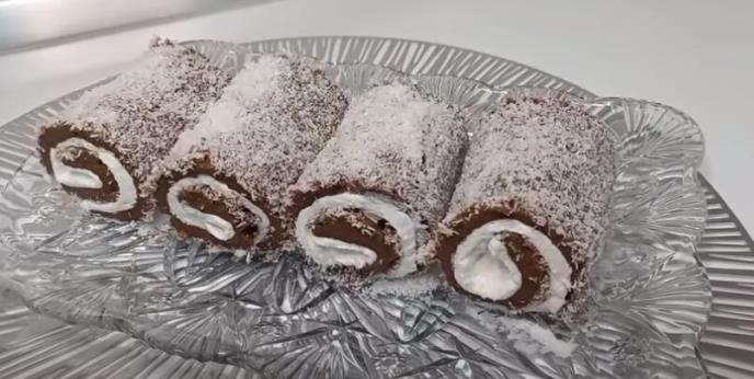 Sada uz pomoć špatule pažljivo odvajajte traku po traku i samo zarolajte u rolnicu. Ako se desi da na ponekom mestu malo popuca, nikakav problem, samo ih pospite kokosom da se ne vidi. ?