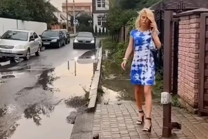 Jedna plavuša se dosetila genijalnog trika kako bi sprečila da je skockanu od glave do pete ne okupa vozač luksuznog automobila, koji se, sudeći po zaletu, spremao baš to da uradi prelazeći preko bare.