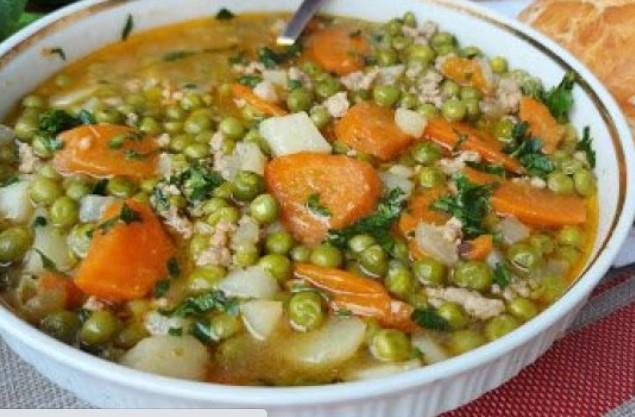Luk i praziluk propržiti na ulju i poslozi, pa dodati meso iseckano na kockice. Začiniti sa suvim biljnim začinom, biberom i slatkom mlevenom paprikom. Ako želite možete da dodate i tucanu ljutu papriku i vlašac. Kada se meso malo upržilo, dodajte sitno seckan krompir, šargarepu i beli luk. Promešajte, pa dodajte grašak i opet promešajte.