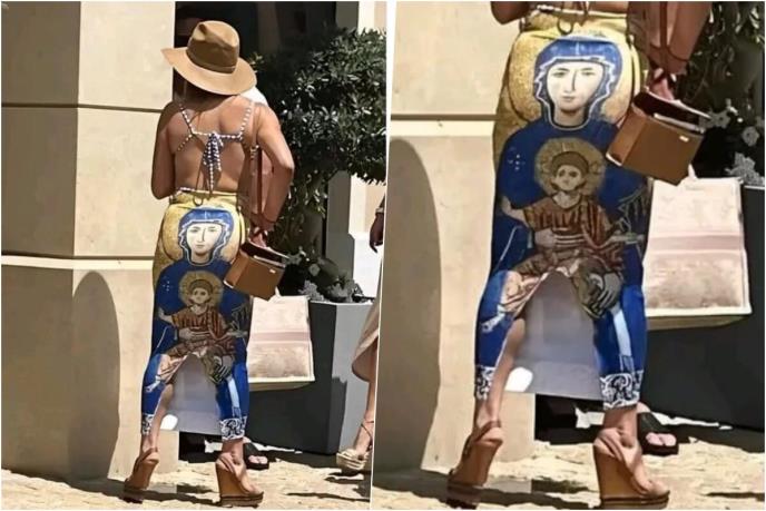 - Ne sumnjam da će se neko naći da je poljubi i ostavi koji dinar - glasio je opis fotografije koja je osvanula na Tviteru, a na kojoj sa leđa vidimo ženu u plavoj haljini sa printom Bogorodice, posred zadnjice, koja u svom krilu drži Isusa Hrista. Svi se pitaju i zamišljaju šta bi tek moglo da se nađe na prednjem delu ove nesvakidašnje haljine, a dotična žena je kombinaciju upotpunila šeširom i visokim platformama, pa je spojila 'tradicionalno' i 'moderno', kako smo mogli da pročitamo u velikom broju šaljivih i ironičnih komentara ispod fotografije.