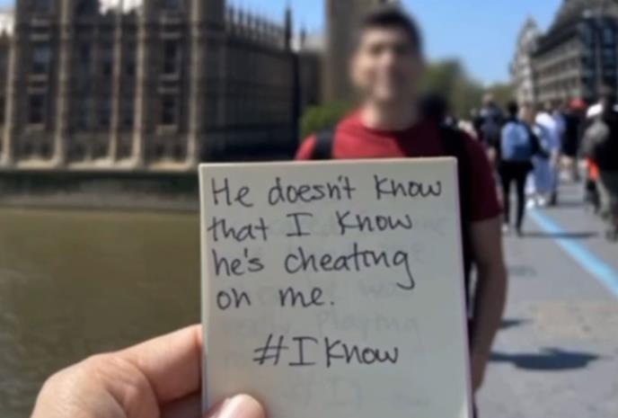 Na jednom papiriću je napisala da je njen dečko često odlazio na putovanja sa drugarima kako bi bio sa drugim ženama. Dok ona pokazuje i fotografiše tu poruku, u pozadini vidimo njega kako pozira ispred Ajfelove kule. Nije ni slutio da su mu sve fotografije sa najlepših mesta na svetu zapravo upropaštene.