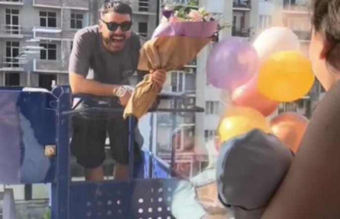 Uz pomoć krana na kom je stajao, zajedno s velikim buketom cveća i mnoštvom balona, popeo se do prozora sobe u kojoj je mama boravila sa bebom. Na snimku se vidi mama sa suzama u očima i oduševljenjem, ali se primećuje i da soba definitivno nije na prvom spratu, već na nekoj dosta ozbiljnijoj visini.