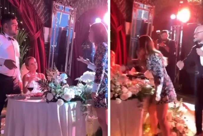 Naime, mladoženja je sedeo sa svojom nevestom za mladenačkim stolom kad im je prišla devojka. Vidno ljuta ona je otvoreno napala mladoženju i to pred njegovom ženom. Na snimku se vidi verbalni napad besne devojke koja je prišla mladenačkom stolu kako bi se obračunala sa mladoženjom. On je najpre bio zbunjen a potom je počeo da se pravda, a malo je falilo da situacija izmakne kontroli. Mladoženja je u jednom trenutku ustao u pokušaju da smiri razjarenu devojku, ali ga je ona gađala u lice belom ružom koju je otkinula sa dekoracije.
