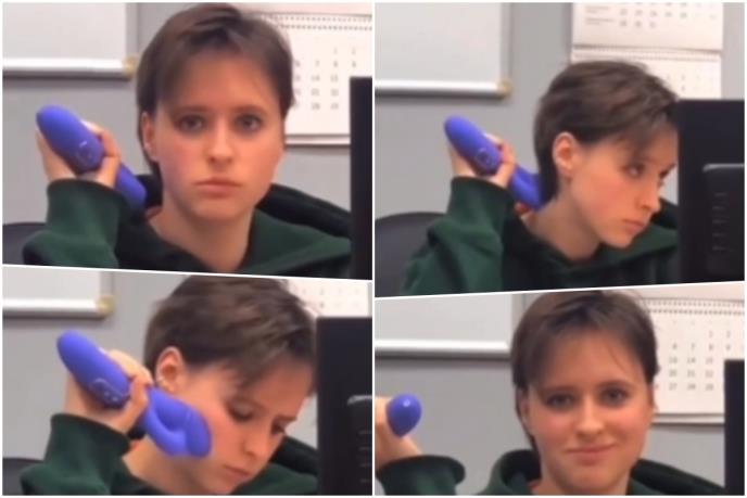 Ovaj snimak kruži društvenim mrežama već izvesno vreme, a nedavno je iznova aktuelizovan. Vidimo devojku koja sedi za stolom, gleda u računar i masira vrat ljubičastim vibratorom, dok je neko od kolega snima.