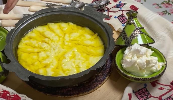 U činiji pomešajte i izmrvite kravlji, koziji sir i kajmak. U šerpi prokuvajte mleko i vodu, a zatim postepeno dodajte smesu sira i kajmaka. Mešajte bez prestanka narednih 15 minuta sve dok voda ne ispari, a smesa ne postane gusta kao testo za palačinke.