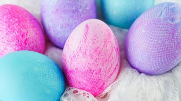 Ohlađena jaja umotajte u milje, neku čipkanu maramu, dekorativnu mrežu ili ribarsku mrežu i vežite gumicom. U posude sipajte boje, vodu i u svaku posudu po kašiku sirćeta. Stavite jaja i ostavite nekih 20 minuta.