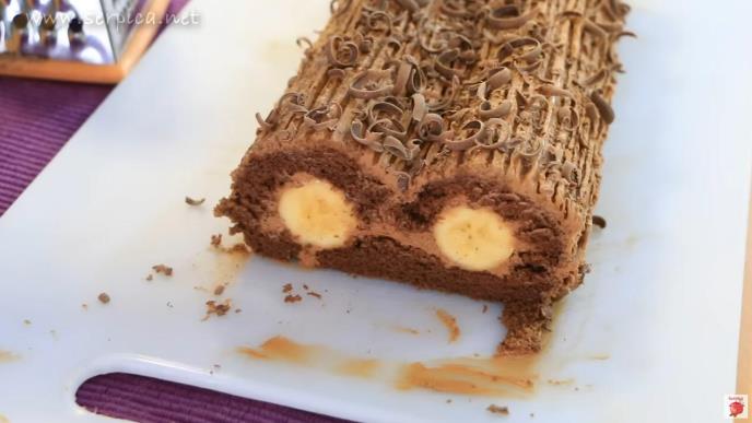 Kada se kora ispeče i blago prohladi, premazaćemo je filom i poređati banane po obodu, a onda ćemo urolati oba kraja, tako da obavijemo banane.
